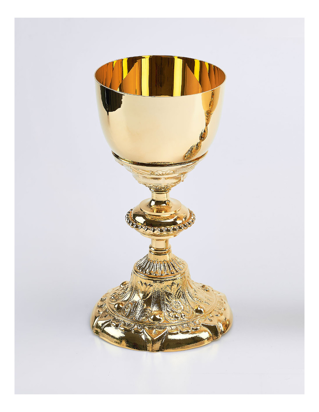 Questo calice è caratterizzato da decori realizzati sulla base e nell'impugnatura di essa con un cura eccezionale dei minimi dettagli. Il calice da messa realizzato in fusione dorata con placcatura oro 24 kt, la coppa di diametro 10,5 cm invece la base di diametro 12 cm. Il suo colore oro le dona un aspetto molto elegante, ideale per tutte le cerimonie ed è disponibile anche la combinazione con la pisside dello stesso design.