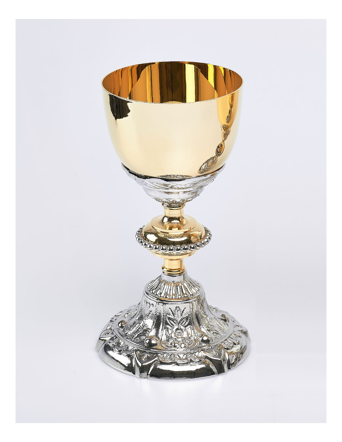 Calice liturgico in fusione bicolore con coppa di diametro di 10,5 cm con stupendi decori in stile barocco