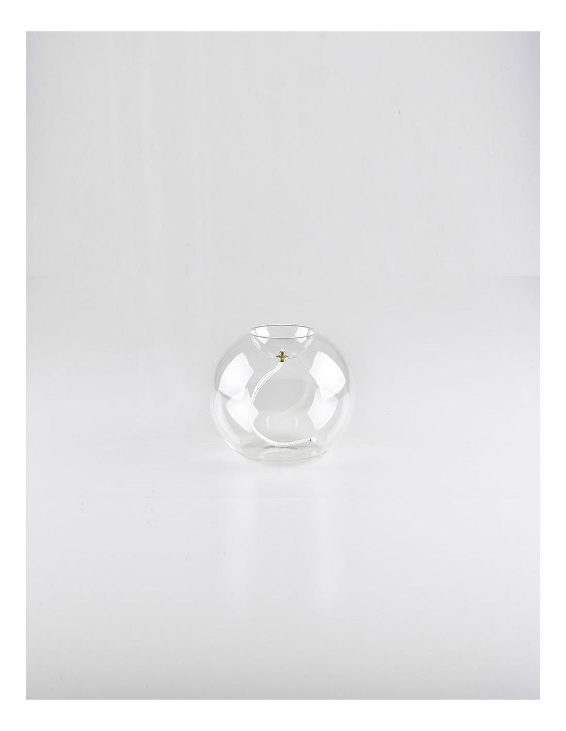 Questa lampada in vetro soffiato ha una forma sferica con un stile molto semplice con la caratteristica della bocca per l'inserimento della cera rialzato.