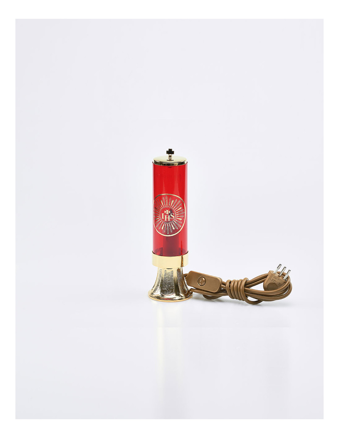 Questa lampada con base alta in ottone placcato oro e con bicchiere in vetro rosso è fornita con impianto elettrico a 220 volts.La caratteristica principale di questo lume è la decorazione di color oro impressa nel vetro con le lettere "JHS" e dalla piccola croce inserita nella parte superiore.