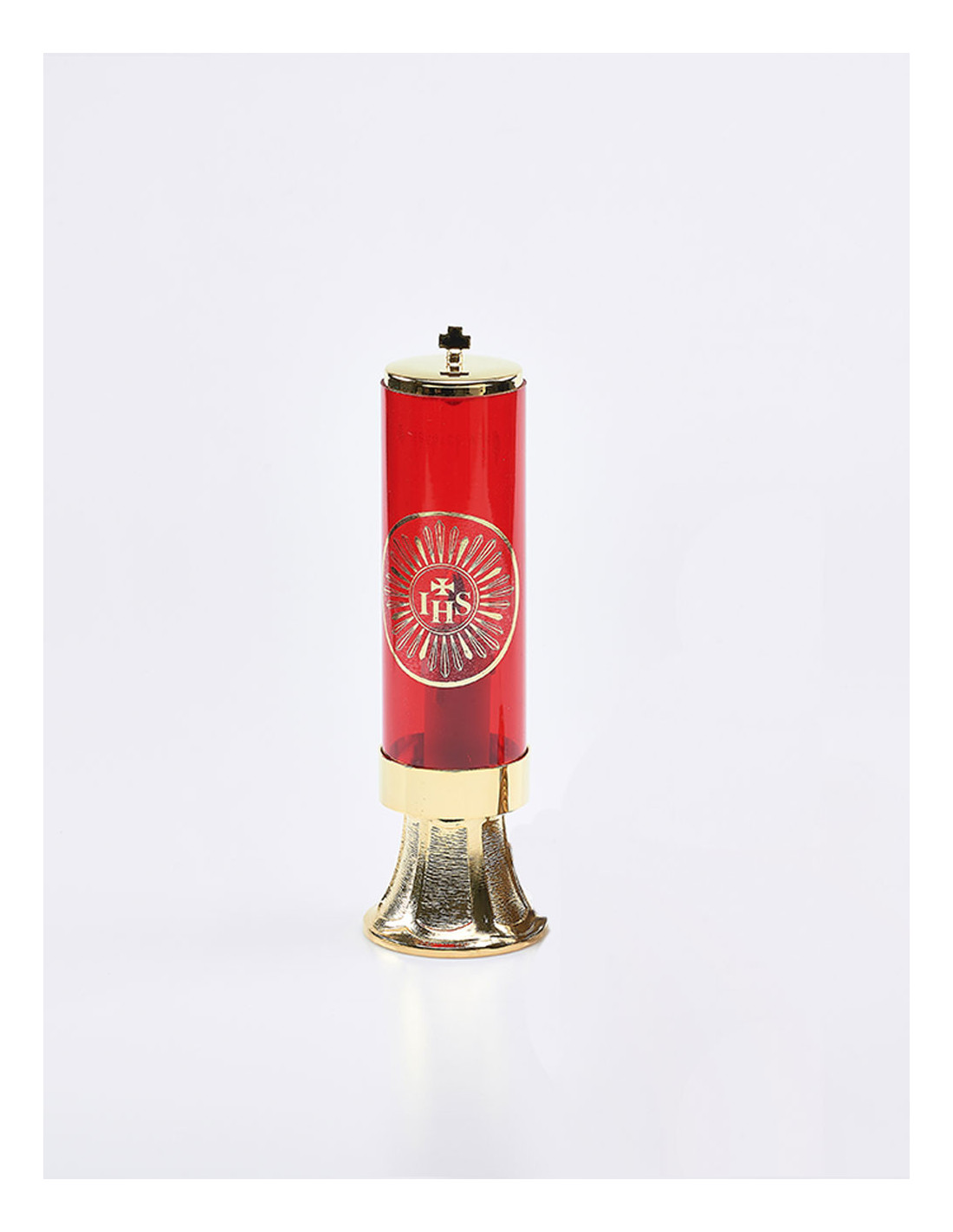 Questa lampada con base alta in ottone placcato oro e con bicchiere in vetro rosso non è fornita di pile per il funzionamento. La caratteristica principale di questo lume è la decorazione di color oro impressa nel vetro con le lettere "JHS" e dalla piccola croce inserita nella parte superiore.