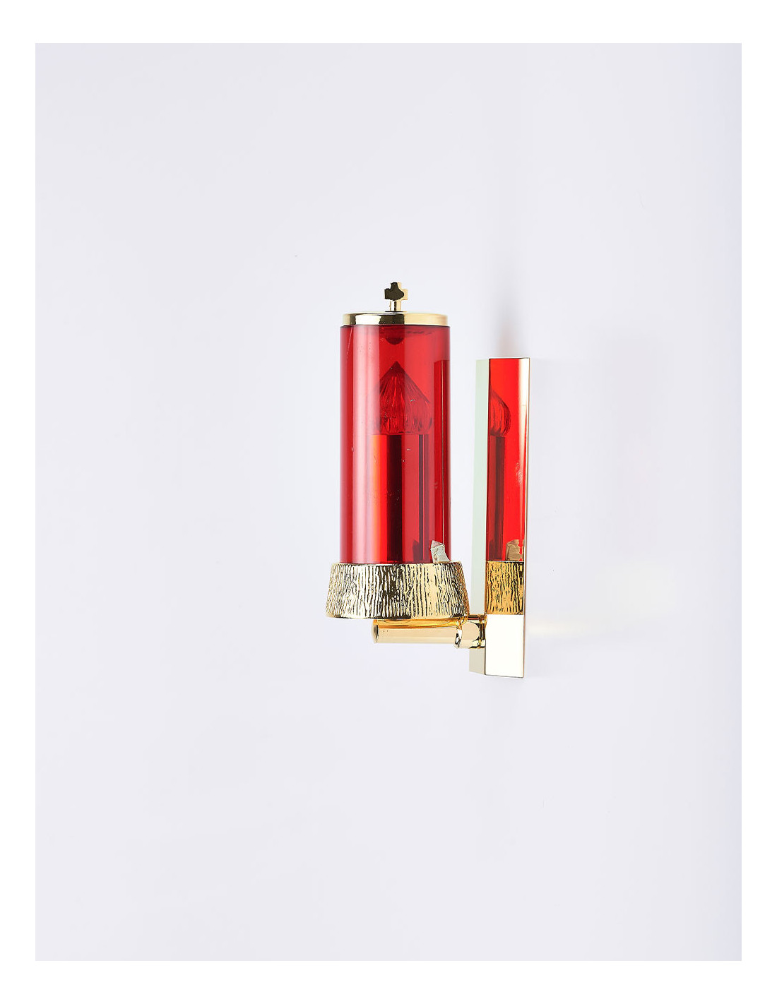 Lume per chiesa realizzata con base alta in ottone finemente decorata e il bicchiere è in vetro rosso.